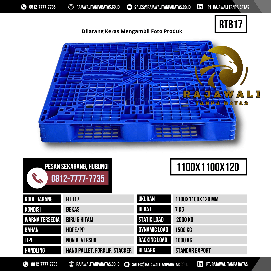 PT Rajawali Tanpa Batas menghadirkan solusi terpercaya untuk kebutuhan logistik dan pergudangan dengan menyediakan pallet plastik berkualitas tinggi. Salah satu produk unggulan kami adalah Pallet Plastik RTB17, hadir dalam ukuran 1100x1100x120 mm, warna biru, dan model jaring yang dirancang untuk memberikan kemudahan, keamanan, serta efisiensi dalam penyimpanan dan distribusi barang. Pallet ini tersedia dalam kondisi bekas maupun baru, sehingga pelanggan dapat menyesuaikan pilihan sesuai kebutuhan dan anggaran.