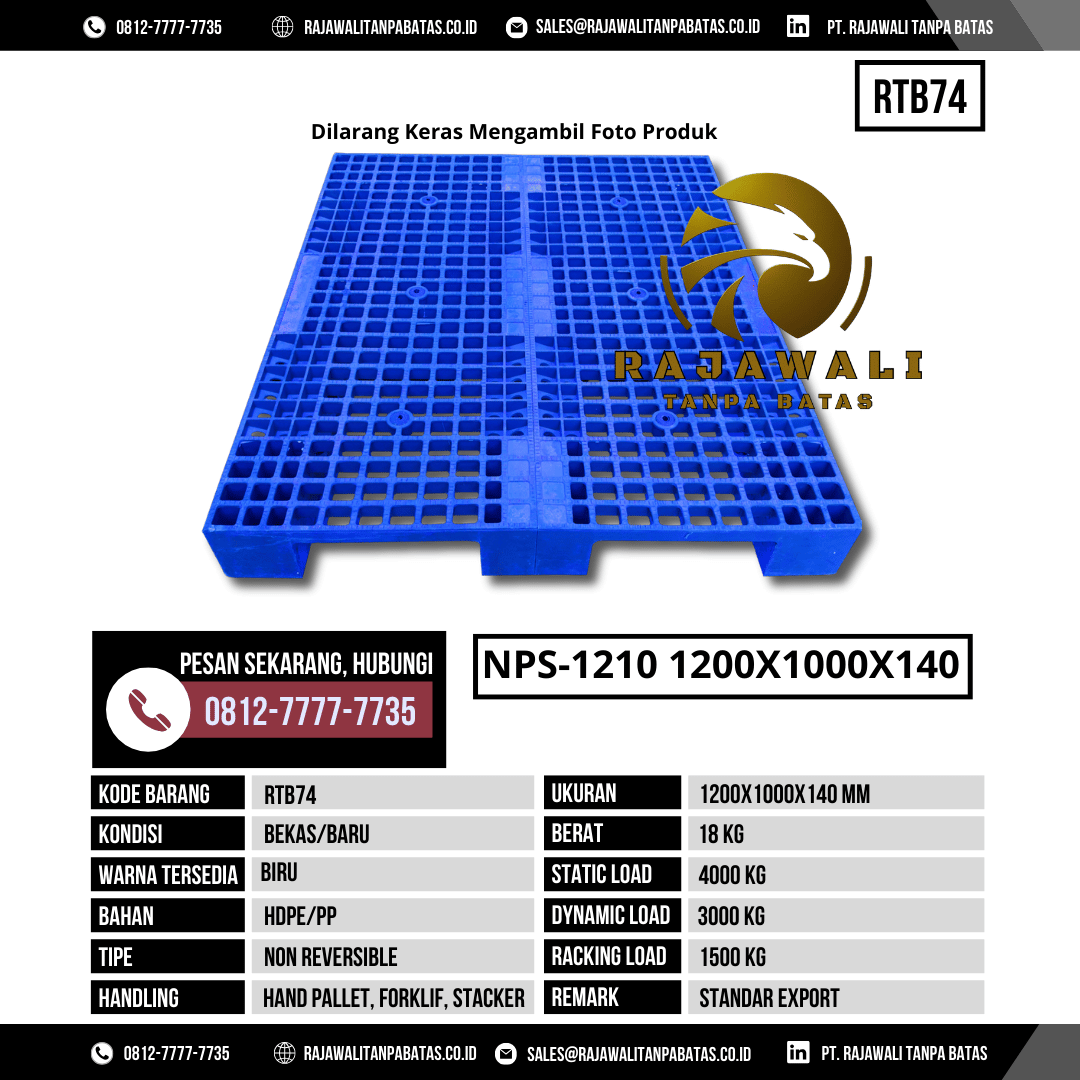Di dunia industri dan logistik, pemilihan pallet yang tepat menjadi salah satu faktor krusial untuk mendukung efisiensi operasional, keamanan barang, dan kelancaran distribusi. PT Rajawali Tanpa Batas menghadirkan solusi unggulan melalui Pallet Plastik Bekas & Baru RTB74 – Biru, yang dirancang khusus untuk memenuhi kebutuhan berbagai sektor industri dengan standar kualitas tinggi, harga terjangkau, dan layanan profesional.