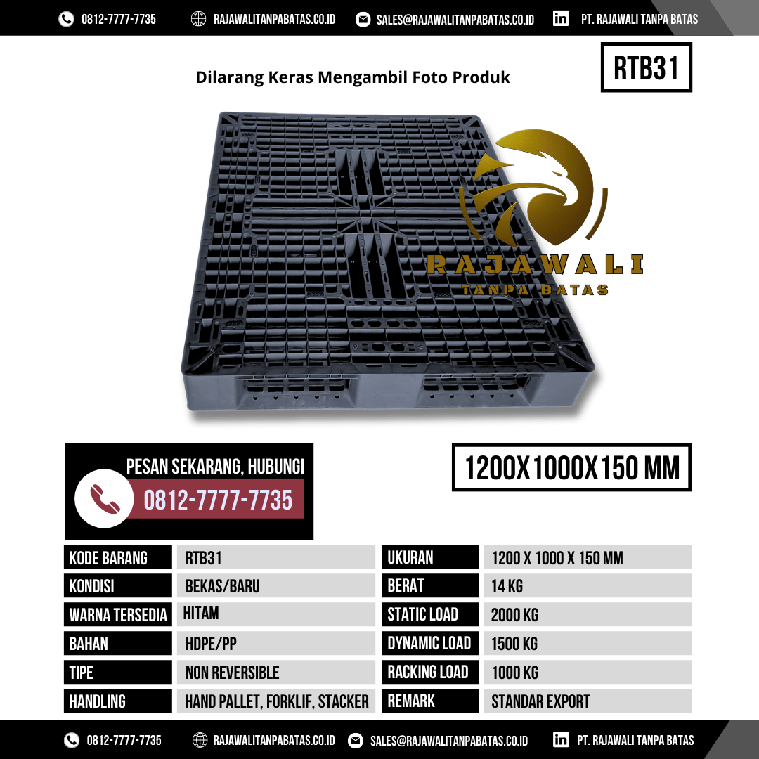 Pallet RTB31 memiliki ukuran 1200x1000x150 mm dan dibuat dari material HDPE/PP, yang dikenal karena kekuatan, daya tahan, dan kemampuannya menahan beban berat. Pallet ini berjenis Non Reversible, sehingga memudahkan penempatan pada berbagai jenis rak maupun permukaan lantai. Dengan bobot 14 kg, pallet RTB31 mampu menahan static load hingga 2000 kg, dynamic load hingga 1500 kg, dan racking load hingga 1000 kg, menjadikannya ideal untuk barang dengan berat sedang hingga berat. Pallet ini kompatibel dengan alat handling seperti hand pallet, forklift, dan stacker, sehingga proses pemindahan dan penyimpanan barang menjadi lebih mudah dan efisien.