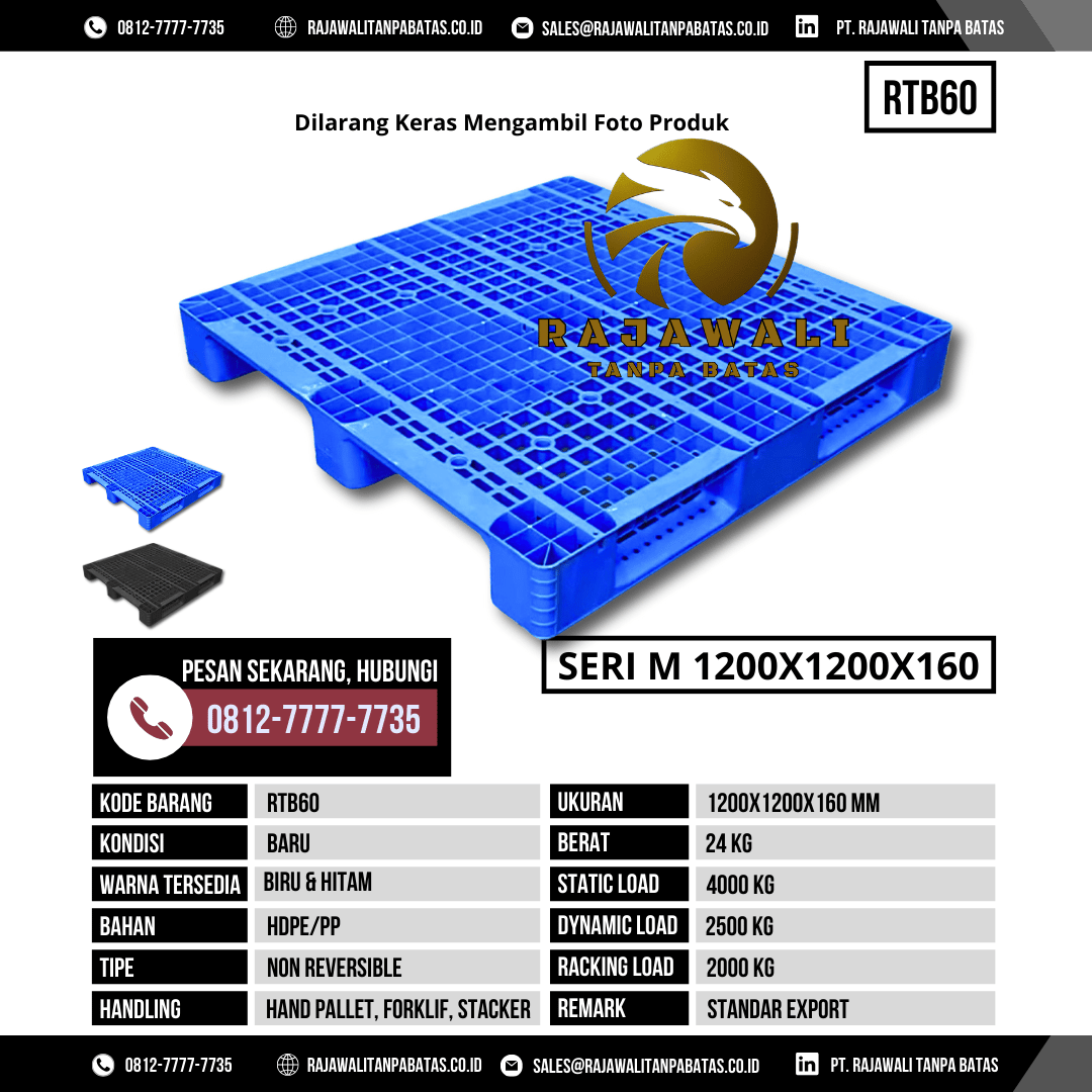 Pallet RTB60 memiliki ukuran 1200x1200x160 mm, memberikan area luas yang memadai untuk menampung berbagai jenis barang. Terbuat dari material HDPE/PP (High-Density Polyethylene / Polypropylene), pallet ini menawarkan daya tahan tinggi terhadap benturan, beban berat, dan berbagai kondisi lingkungan. Meskipun tipe pallet ini adalah Non Reversible, desainnya tetap praktis dan memudahkan penanganan serta penyimpanan barang secara aman.